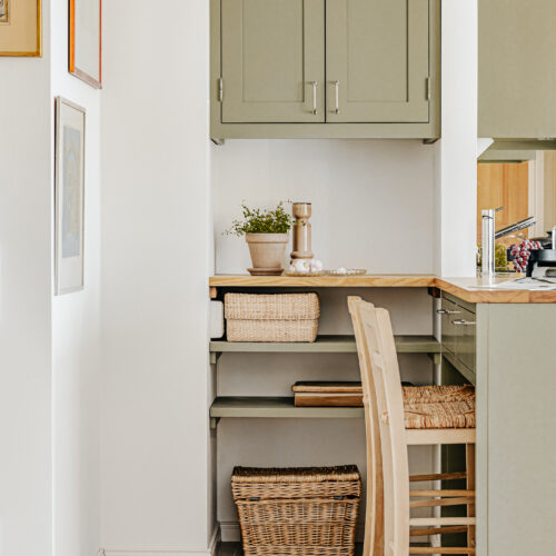Johanna og Mattias bor i økolandsbyen Understenshöjden utenfor Stockholm, og der er dette store vinkelkjøkkenet. Malt i fargen…